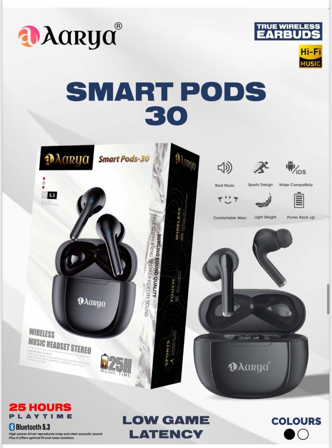 AARYA TWS SMART PODS-30 TRUE WIRELESS EARBUDS .25H MUSIC TIME .12M EFFECTIVE DISTANCE .LONG BATTERY LIFE .WIRELESS 5.3 .LIGHTWEIGHT AND PORTABLE .TOUCH CONTROL .IP4 WATERPROOF CHARGING POWER 5V/26mA .MUSIC STUDIO